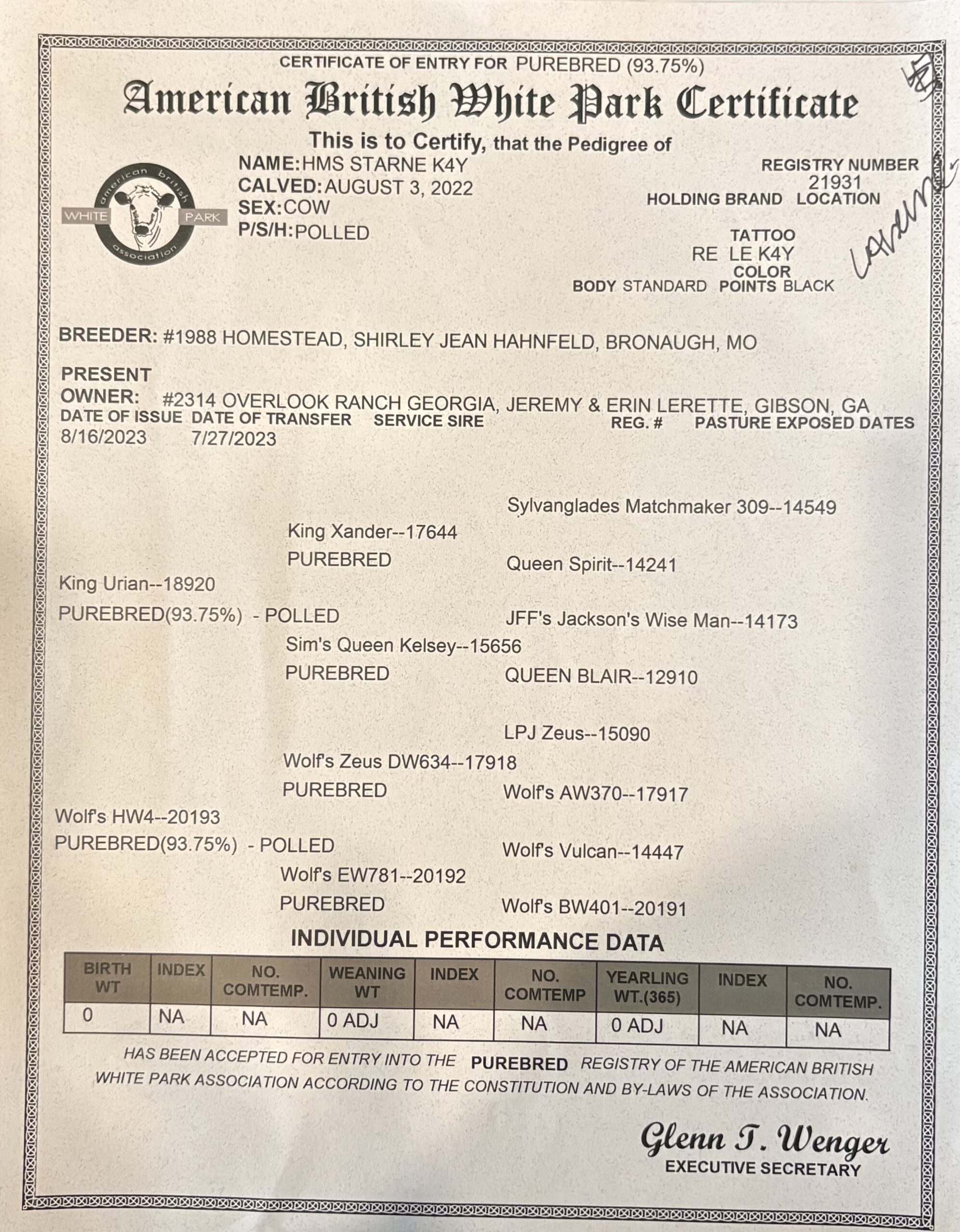 HMS Starne k4Y (Laverne) x Bledsoe’s Little Man, Heifer Calf for sale. OLR BB (Bread and Butter) Calf Born 10/30/2025. No Assistance. Great Markings. Classic British White Park. Registered upon Sale. Available for pick up 5/2026. Will hold in our pastures till weaning at 6 months.
